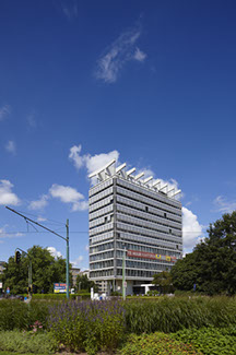 Door deze hangende constructie wordt men op de verdiepingen niet langer gestoord door muren of kolommen zodat men de indeling naar believen kan wijzigen. De lichte glazen gevel zorgt voor een maximale lichtinval.